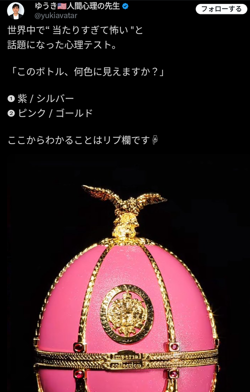 【画像】このボトルが「何色に見えるか」で脳の構造が分かるらしいwwww